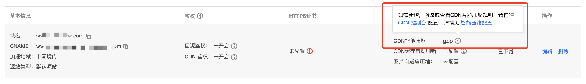 6. 在个性化配置列中的 CDN 智能压缩 ,可查看 Gzip 压缩的配置状态和已配置的压缩方式。